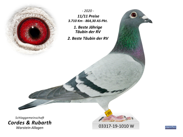2020 wurde sie mit 11/11 Preisen und 864 AS-Punkten die beste Täubin der RV Möhnetal-Warstein. Da zeigte sie schon das sie absolute Spitze fliegen kann. Sie flog 2020 4x unter die ersten 10 Preise in der RV.