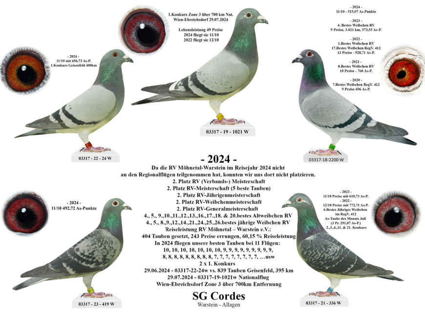 - 29.06.2024 03317-22-24w gegen 839 Tauben ab Geisenfeld 395km (mehr)