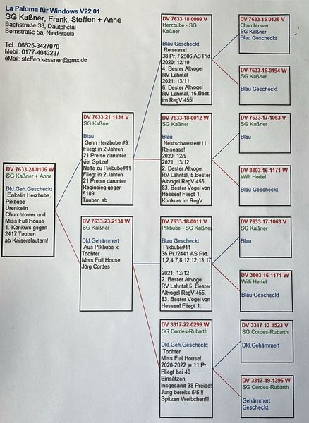 Am letzten Wochenende erreichte uns die schöne Nachricht, dass bei der SG Frank, Steffen + Anne Kaßner eine Nachzuchttaube aus unserer "Miss Full House" (03317-19-1396) den 1. Konkurs in der RV geflogen hat.