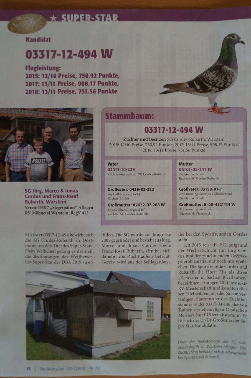 Unsere 03317-12-494w hat die Zusage für den "Superstar 2019" bekommen. Damit haben wir nun zum 3. Mal die Chance eine Taube auf der DBA ausstellen zu dürfen.